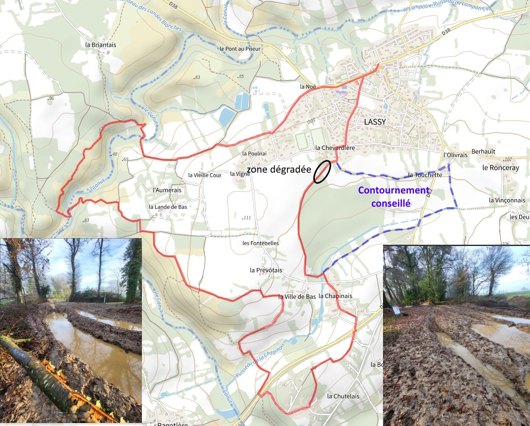 Dégradation importante d’un chemin au sud-ouest de la Chevardière. Il est conseillé de contourner la zone par l’est avec une rallonge de 1 100 m.