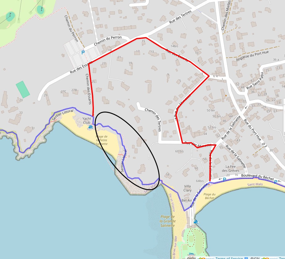 Suite à une dégradation du sentier côtier entre les plages de la Petite Salinette et de la Grande Salinette, le GR® 34 est dévié à partir du yacht-club par le chemin des Essarts, la rue des Essarts, la rue des Mimosas et la rue de la Salinette pour rejoindre le boulevard du Béchet .
